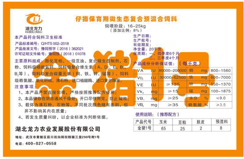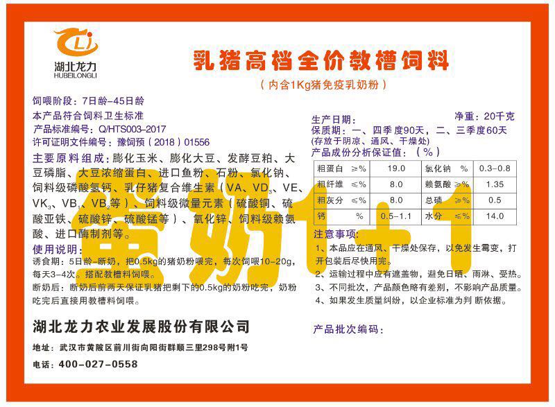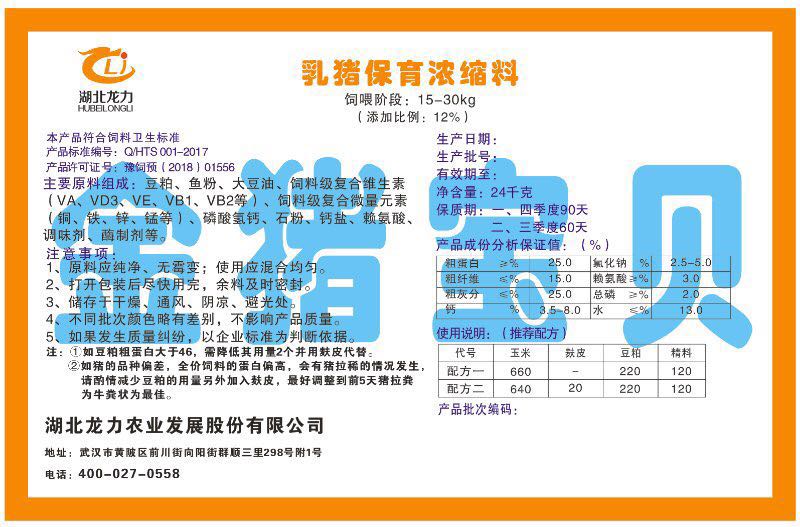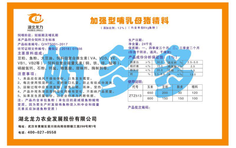 湖北龍力農(nóng)業(yè)發(fā)展股份有限公司坐落于武漢市黃陂區(qū)前川街向陽街群順三里298號附1號。公司成立于2014年6月,公司自成立以來把“創(chuàng)全球最大養(yǎng)豬綜合服務”為企業(yè)愿景。致力于打造教保料品牌”作為公司發(fā)展的明確目標。公司一直致力于豬營養(yǎng)的研究和開發(fā),積極與國內(nèi)外高校和科研機構(gòu)合作,推廣養(yǎng)豬技術、動物營養(yǎng)新概念,向世界農(nóng)牧企業(yè)學習與合作。公司采用國內(nèi)先進的生產(chǎn)工藝,選擇高精度電子配料秤,高均勻度、無殘留混合機等先進設備....